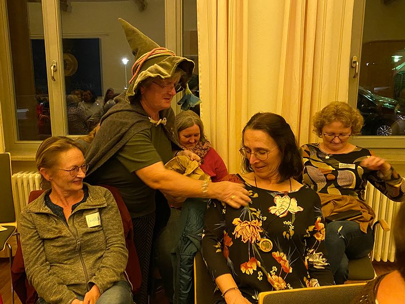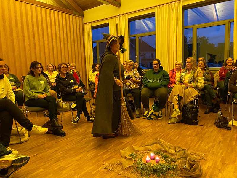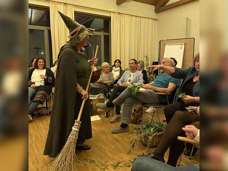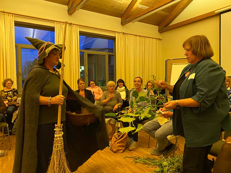 Apotheker Roland Andre entführte als erster Referent die Zuhörer in die Welt der adaptogenen Pflanzen. Witterungsbedingt musste der abendliche Märchenspaziergang rund um das Kloster mit Ausklang am Lagerfeuer in die Innenräume verlegt werden. Als Hexe verkleidet erklärte Karin Müller bei Kerzenschein nicht nur einem anwesenden „Gscheidhaferl“ auf sehr humorvolle Art, was man mit den mitgebrachten Kräutern so alles machen kann. Ein Märchen von der Linde gab Angela Marmor zum Besten und überraschte mit dem magischen Feuerzauber der Bärlappsporen. Mit der Verteilung einer „Hexenbrosche“ endete das schauspielerische Spektakel. Der gemütliche Ausklang im Klosterstüberl fand rege Teilnahme und währte bis spät in die Nacht. Ein kleines Extra-Highlight zwischen den Aktionen waren die Prüfungstische der an diesem Tag zur Abschlussprüfung angemeldeten frischgebackenen Kräuterpädagoginnen.