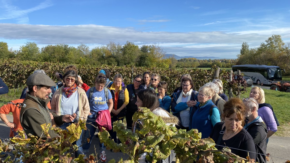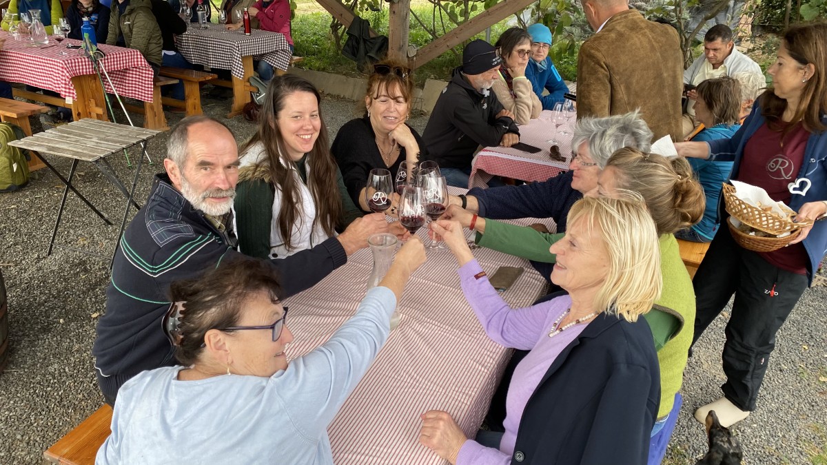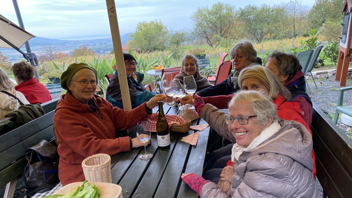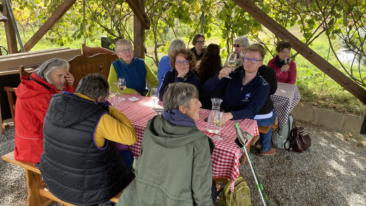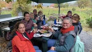• Für den Nachmittag stand eine Jause bei Jànos vom Weingut von Beöthy und eine Wanderung zur Burgruine Csobànc auf dem Programm. Von der Terrasse des Weingutes genoss man bereits einen grandiosen Ausblick auf den Balaton. Den steilen Aufstieg zur Burgruine nahmen dennoch einige auf sich.