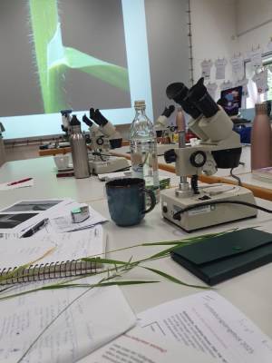 Unglaublich faszinierte Blicke erlebten alle beim Blick durch Mikroskope die von der Umweltstation Haus Isarmündung zur Verfügung standen. Nach Hüll-, Deck-, und Vorspelzen machte Hansjörg Hauser in seinen Ausführungen Lust auf mehr Spezialwissen, so dass kein Gras über diesen Tag mehr wachsen konnte.